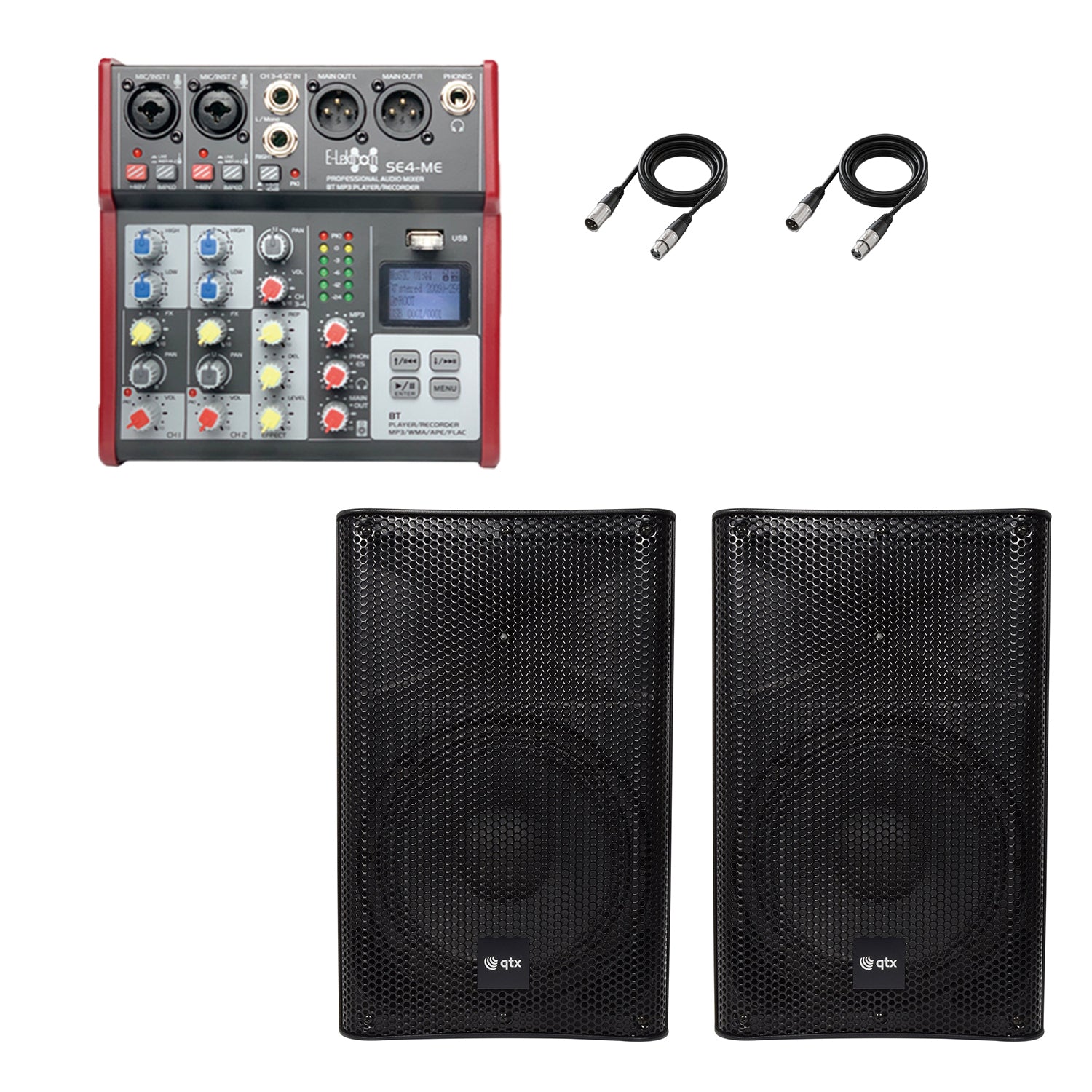 QTX Quest 12QMS 1440W Active PA Speaker Stereo Pair Bundle | Bluetooth 4-Channel Audio Mixer & 2x XLR Cables